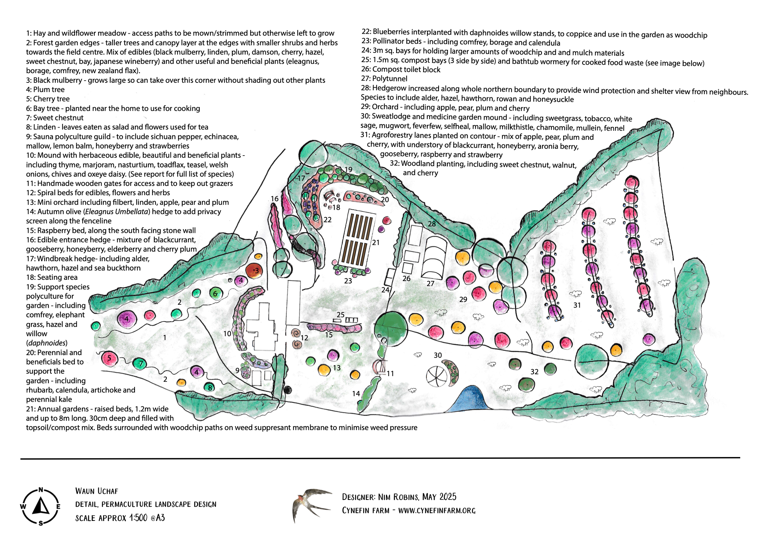 The design included a huge variety of edible and medicinal plants, shrubs and trees in a variety of different systems. Forest gardens, agroforestry planting on contour, orchards, coppice plantations, shelterbelts, hedgerows and a nut orchard were all placed in different spaces within the landscape depending on sunlight, shelter and access. A wild swimming pond and camping area were integrated for enjoyment and retreats, and the whole site was sensitively designed in deep respect of the surrounding environment and rich wildlife.